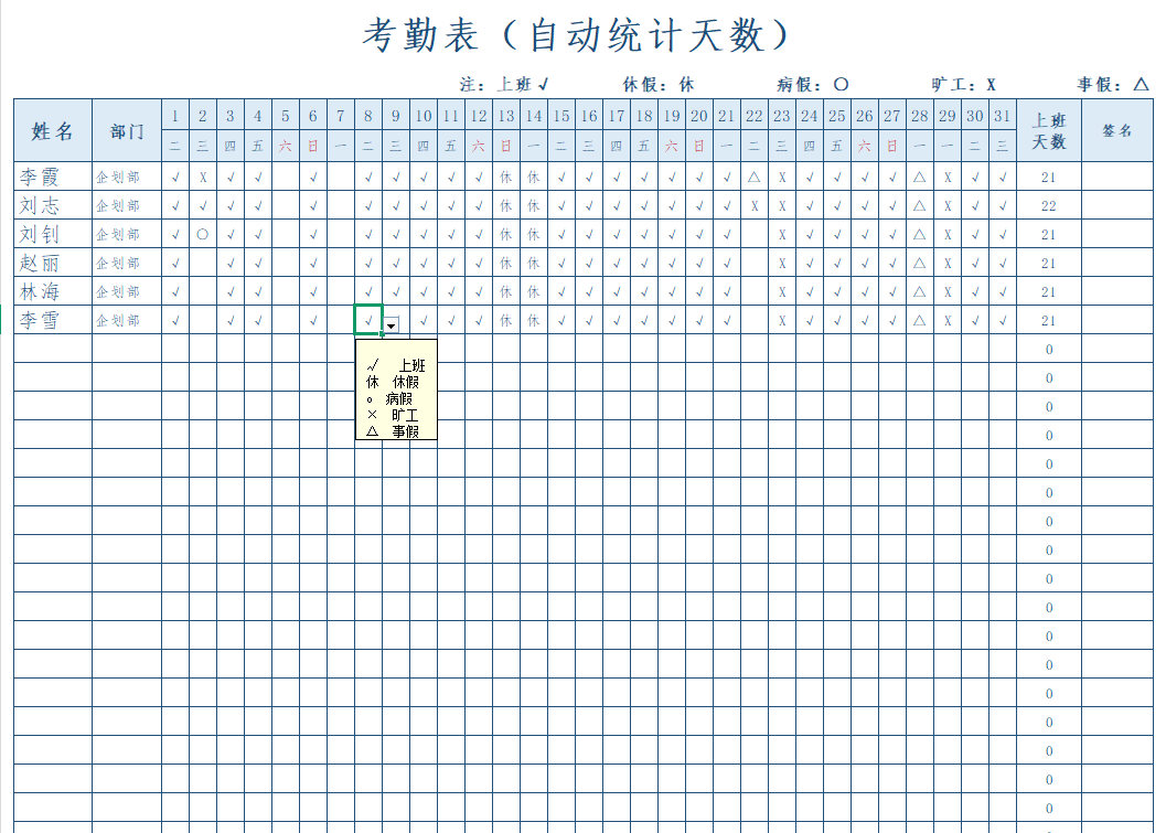 考勤绩效统计表(自动统计天数).xlsx
